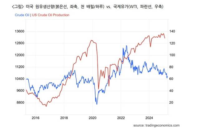 그는 대체 무슨 생각을 하는 걸까? 다른 사람의 속내를 정확하게 알기는 어렵지만, 가장 큰 기대를 거는 것은 셰일 증산인 것으로 보인다. 아래 첫 번째 [그림]에 표시된 것처럼, 트럼프 행정부 1기(2017~2020년) 미국의 하루 원유 생산량은 800만 배럴 수준에서 1300만 배럴 수준까지 껑충 뛰고 국제 원유 선물이 급락했다.