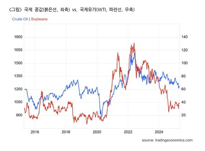 유가가 폭락하면 에너지 비용이 저렴해지는 것은 물론, 옥수수와 콩을 비롯한 곡물 가격의 하향 안정으로 이어진다. 왜냐하면 휘발유 가격이 내려갈 때 바이오 에탄올 혼입을 줄이는 경향이 나타나기 때문이다. 휘발유나 디젤유 가격이 급락했는데, 굳이 연비가 좋지 않고 또 엔진 노화 우려가 있는 바이오 연료를 넣지 않으려는 것이다. 이 과정에서 바이오 에탄올 재고가 증가하고, 이는 다시 국제 콩값의 하락으로 연결되는 경우가 잦다.