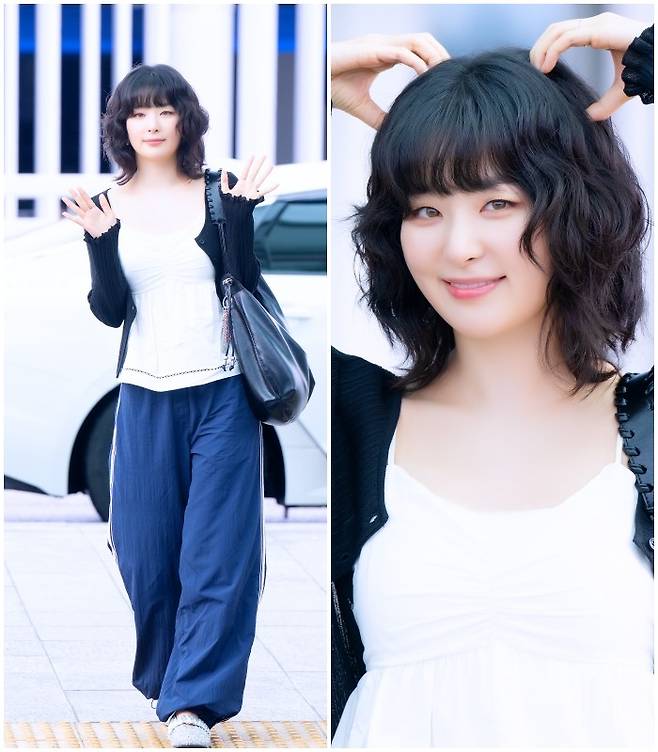 슬기는 네이비 팬츠에 화이트 블라우스, 가디건을 매치해 러블리한 공항패션을 연출했다. 인형같은 미모가 돋보였다.