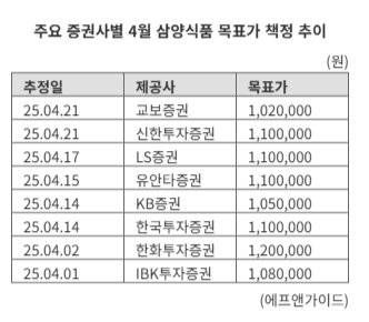 외식 물가 상승과 해외 수출 호조에 따른 실적 개선 기대감이 주가 급등세를 이끌면서 주요 증권사들은 일제히 삼양식품의 목표주가를 상향 조정했다.