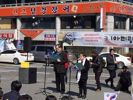 | ▲ 2016년 3월 대회사를 낭독하고 있는 일본군 '위안부' 피해 할머니 진주기림사업회 서도성 2016년 3월 대회사를 낭독하고 있는 일본군 '위안부' 피해 할머니 진주기림사업회 서도성, 강문순 공동대표. 출처 : 단디뉴스(http://www.dandinews.com) |