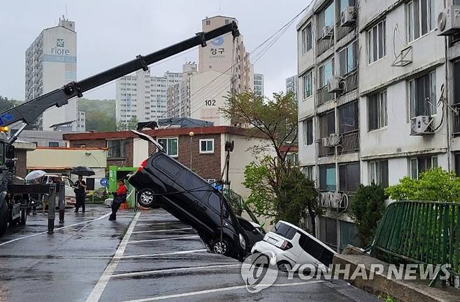 (남양주=연합뉴스) 22일 오후 1시 10분께 경기 남양주시 화도읍의 한 아파트 지상 주차장의 옹벽이 무너져 내렸다. 이 사고로 주차된 차량 6대가 옹벽과 함께 아래로 빠져 파손됐다. 2025.4.22 [경기도북부소방재난본부 제공. 재판매 및 DB 금지]