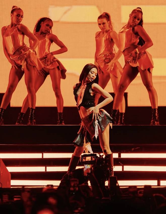 - 블랙핑크 리사, 코첼라 두 번째 무대도 압도…레드 파충류 바디슈트로 ‘시선 집중’