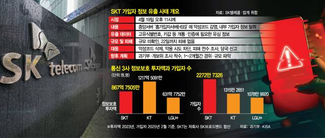 통신사의 가입자 정보 유출 사고가 2년여 만에 재발하면서 업계 전반적인 보안 대비도 요구된다. LG유플러스도 2023년 초 가입자 30만 명의 정보 유출 사태를 겪으며 정보보안 투자를 늘리는 등 보안 강화를 단행한 바 있다. SK텔레콤과 자회사 SK브로드밴드를 합친 정보보호 투자액은 2023년 기준 868억 원이었다. 업계 2위 KT(1218억 원)보다 적고 LG유플러스(632억 원)와도 큰 차이가 안 난다. SK텔레콤의 고객용 휴대폰 가입회선은 올 2월 2273만 명으로 점유율 40%를 차지했다.