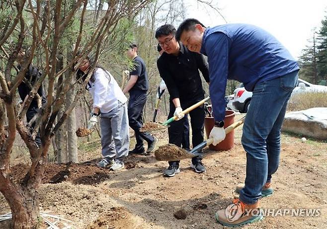 (대전=연합뉴스) 박석희 국립춘천숲체원장(오른쪽)이 22일 지구의 날을 맞아 강원도 춘천시 신북읍 춘천숲체원에서 직원들과 기념식수를 하고 있다. 2025.4.22 [국립춘천숲체원 제공. 재판매 및 DB 금지]