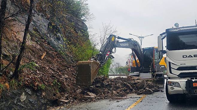 오늘(22일) 오후 소양강댐 진입도로에서 낙석이 발생해 춘천시가 긴급 복구공사를 벌였습니다.