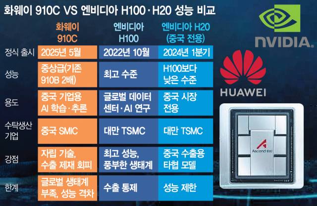 화웨이가 미국 엔비디아의 인공지능(AI) 칩 H100 성능에 맞먹는 최신 AI 칩을 다음 달부터 공급한다고 알리며 미국의 수출통제에 맞선 중국의 반격이 본격화하는 양상이다. 미국 정부가 엔비디아의 중국 맞춤형 AI 칩 H20 수출을 막으면서 화웨이가 그 빈자리를 채울 것이라는 우려가 현실이 되고 있다. 화웨이가 공격적인 행보를 보이면서 엔비디아에 고대역폭메모리(HBM)를 공급하는 SK하이닉스와 삼성전자 등도 촉각을 곤두세우고 있다. 다만 화웨이의 기술 수준이 어느 정도인지 정확하게 알려지지 않은 만큼 좀 더 지켜봐야 한다는 신중론에 무게가 실린다.