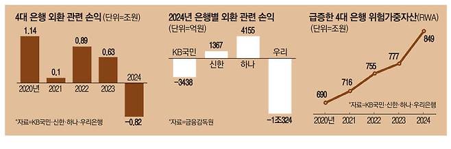 지난해 KB국민·신한·하나·우리은행 등 4대 은행이 외환 거래에서 13년 만에 손실을 기록한 것으로 나타났다. 달러 대비 원화값이 지난 한 해 동안 200원 넘게 폭락했기 때문이다. 건전성에 직접적인 영향을 미치는 위험가중자산(RWA) 또한 외화 표시 자산의 급증에 따라 9년래 최대 폭으로 불어났다. 시중은행은 외화 관련 리스크가 올해도 지속될 가능성이 있다고 보고 대응책을 마련하고 있다.