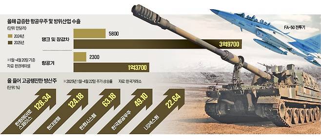 수출 호재가 잇따르면서 한화에어로스페이스와 현대로템 주가는 올해 두 배 이상 급등했다. 한화시스템(63.18%), 한국항공우주(49.10%) 등도 강세였다. 방산 종목은 외국인 순매수 상위권을 휩쓸고 있다. 한화에어로스페이스는 올해 외국인 순매수 1위(7900억원)다. LIG넥스원과 현대로템도 3위(2360억원) 및 10위(1220억)를 기록 중이다.