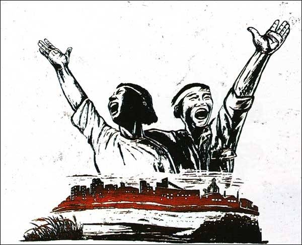 | ▲ 김봉준 <동트는 그날> 김봉준 작품 4, <동트는 그날>, 1999, 실크스크린판화. 80x110cm |