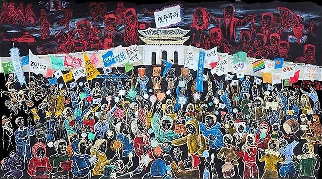 헌법재판소가 윤석열대통령 파면을 앞둔 4월 3일 밤 김봉준 작가는 광화문 광장에서 날밤을 새웠다고 한다. 70대 초반의 나이에 불구하고 말이다.