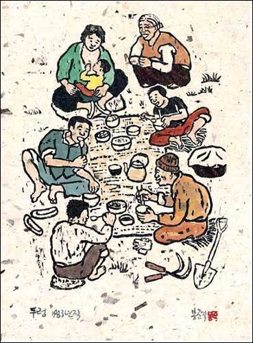 팔을 높게 치든 역동적인 노동자들을 그린 작품에서는 나도 모르게 주먹이 쥐어졌으며, 둥그렇게 논바닥에 앉아 새참을 먹는 작품에서는 유년시절 외갓집에서 보았던 정겨운 농촌 풍경이 떠 올랐다.