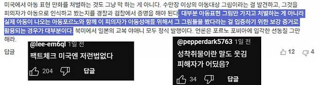 그럼에도 댓글 등을 통해 ‘법 내용은 이렇지만 실제 피해자가 있어야 처벌로 이어진다.’, ‘가상의 만화도 처벌한다는 판례가 있냐?’와 같은 주장들이 제기됐습니다.