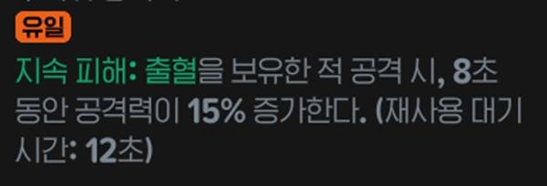지속 피해: 출혈을 보유한 적 공격 시 8초 간 공격력이 15% 증가하는 효과를 가졌다. 출혈을 일으키는 룬과 함께 쓰면 좋은 효율을 낸다. 다만, 트리거 룬이 없으면 없는 효과나 마찬가지다.