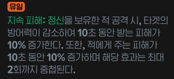 지속 피해: 정신을 보유한 적 공격 시 타깃의 방어력이 감소하여 10초 동안 받는 피해가 10% 증가한다. 또한, 적에게 주는 피해가 10초 동안 10% 증가하며 해당 효과는 최대 2회까지 중첩되는 사기적인 효과를 보유했다. 다만, 지속피해 정신은 펫에 한정돼 조건 만족을 위해서는 나름의 투자가 필요하다.