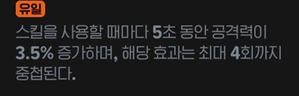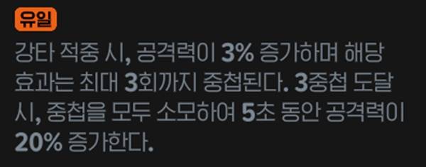 강타 적중 시 공격력이 3% 증가해 3스택 도달 시 중첩을 모두 소모해 5초 동안 공격력이 20% 증가하는 효과를 지녔다. 별도의 내부 쿨이 없어 강타 스킬이 있는 클래스는 대부분 혜택을 누릴 수 있어 효율이 좋다.