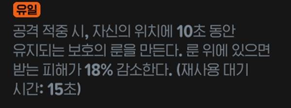 공격 적중 시, 자신의 위치에 10초 동안 유지되는 보호의 룬을 만들고, 그 위에 있으면 받는 피해가 18% 감소한다. 근접 클래스의 생존력을 올려준다. 지속시간 10초, 내부 쿨 15초로 약 5초의 로스가 발생한다.