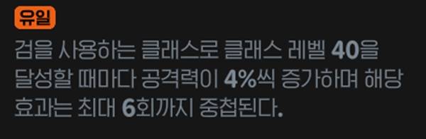 검을 사용하는 클래스의 레벨을 40 달성할 때마다 공격력이 4%씩 증가한다. 현재 전사 3클래스, 빙결술사 총 4개가 있다. 추후 도적 클래스가 업데이트돼 2종이 추가돼 최대 24%의 공격력 증가를 얻는다. 조건 만족 시 상시 적용이라는 메리트가 있다.