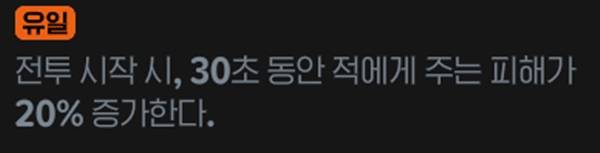 전투 시작 시에만 1번 공격력 20% 증가 효과를 얻는다. 지속 시간은 30초로 긴 편으로 웨이브 형태로 구성되는 어비스나 여러 던전에서 효율이 좋다. 다만, 레이드 단일 보스가 나오면 가치가 감소할 가능성이 크다.