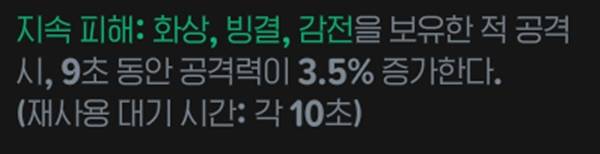 감전/빙결/화상인 적 공격 시 공격력 10.5% 증가 효과를 받는다. 지속피해 룬과 조합하면 효율이 좋지만, 흡혈과 마찬가지로 트리거가 없다면 효과가 없는 것과 같다.