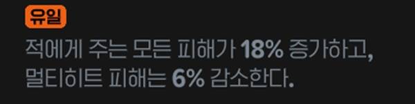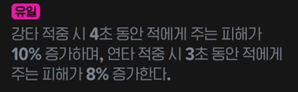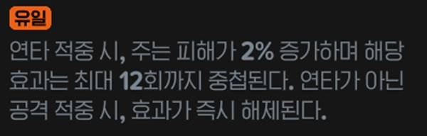 강타 적중 시, 연타 적중 시 각각 10%, 8% 피해 증가가 적용된다. 에픽 룬이지만 무기에서 챙기기 어려운 피해 증가 옵션으로 적용돼 가치가 상승했다.