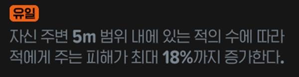 자신 주변 5m 범위 내에 있는 적의 수에 따라 적에게 주는 피해가 최대 23%까지 적용된다. 텍스트 표기로는 '18% 증가'로 명시돼 있지만, 기본적으로 5% 피해 증가가 적용되는 것으로 확인된다. 몬스터 한 마리당 15%, 18%, 23% 증가다.