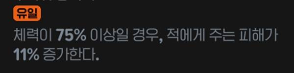 체력이 75% 이상일 경우 공격력 11% 증가 효과를 낸다. 텍스트에는 '주는 피해'로 명시돼 있는데 공격력 증가다. 조건 만족이 꽤 까다로워보이지만, 현재 콘텐츠에서 물약과 붕대의 효율이 매우 좋아 체력 유지가 쉽다.