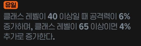 클래스 레벨이 40 이상일 때 공격력 6%, 65 이상 시 4% 증가하는 룬이다. 최대 10% 증가다. 클래스 레벨만 만족시키면 상시 공증이라는 점에서 메리트가 있다.