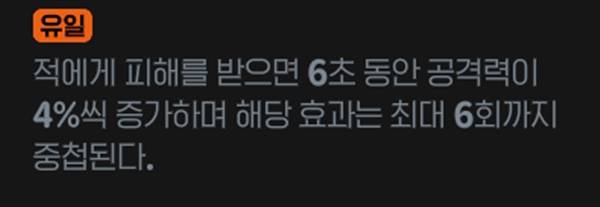 적에게 피해를 받으면 6초 간 4%씩 최대 24%까지 공격력이 증가한다. 전사 계열 직업 등 근접 클래스와 적합한 룬이다.
