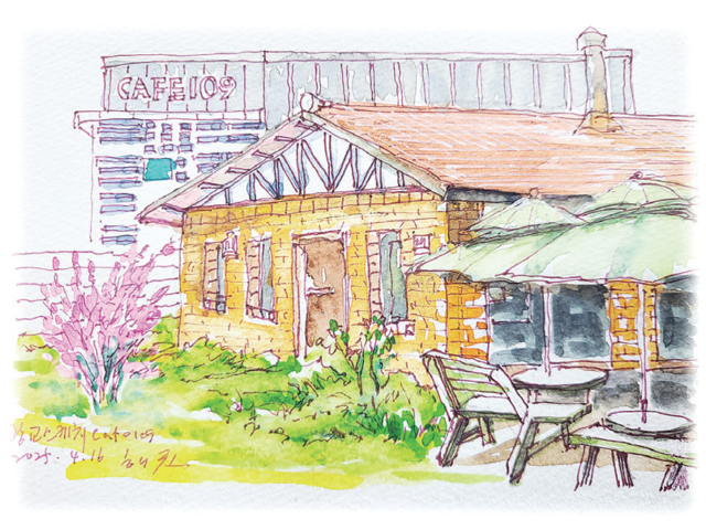 상광교 로컬푸드 옆에 카페 109가 보인다. 봄날 아침, 올해도 사월 스케치는 이곳 전원 풍경을 택했다. 이슬 맺힌 아침은 다소 쌀쌀하다. 목장과 마을을 한 바퀴 답사하는데 할아버지 한 분이 수상한 듯 기웃댄다. 그림 그리러 왔다고 하자 엉겅퀴처럼 곤두선 표정을 낮달처럼 하얗게 밝혔다. 수강생들이 저마다의 위치에서 그림을 그린다. 그 모습이 신선하고 진지하다. 할아버지는 이 주변 카페와 건물의 주인이라며 이야기를 속도감 있게 꺼냈다. 올해 한 살 빠지는 90이라며 1967년 상수도보호시설 공사 때 이곳에 왔단다. 이전엔 대학 레슬링부에서 선수 생활을 하셨다는데 고향은 이북이라고 한다. 1969년 전기불도 없고 차도 다니지 않던 이곳에 젖소 두 마리와 정착했다며 자신을 이석삼으로 소개했다. 소는 불어나 100마리에 이르렀고 그는 2천평, 1천평, 600평 광교산 길 일대를 구석구석 사들였단다.