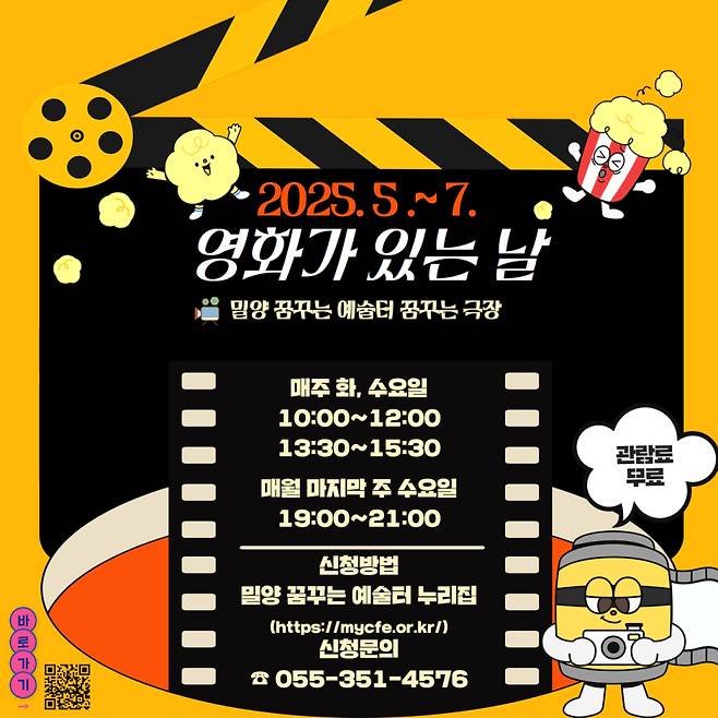 밀양문화관광재단은 오는 5월부터 12월까지 밀양 꿈꾸는 예술터 내‘꿈꾸는 극장’에서 무료 영화 상영 프로그램인‘영화가 있는 날’을 운영한다.