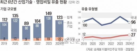 22일 송재봉 더불어민주당 의원이 경찰청으로부터 받은 산업 기술·영업 비밀 유출 현황 자료에 따르면 2019~2024년 발생한 전체 유출 피해는 712건으로, 이 중 중소기업 피해는 625건(87.7%)에 달했다. 대기업 피해는 87건(12.2%)이다.