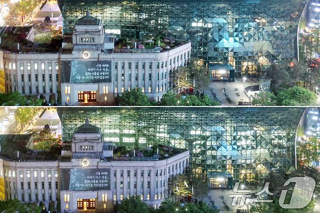 (서울=뉴스1) 민경석 기자 = '제55회 지구의 날'을 맞은 22일 서울 중구 서울시청 실내외 조명이 저녁 한때 10분 동안 소등됐다. 사진은 소등 당시와 이후 서울시청의 모습.