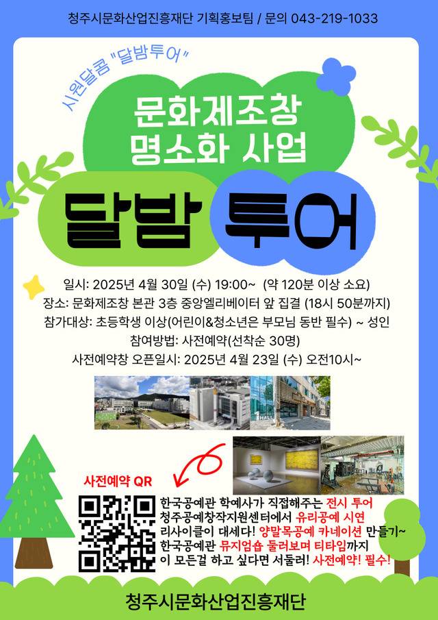 [충청타임즈] 충북 청주시문화산업진흥재단은 오는 30일 문화제조창에서 '달밤투어'를 운영한다.