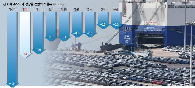 한국 경제가 미국발 자동차·철강 고율 관세의 직격탄과 상호관세 불확실성에 크게 흔들리고 있다. 22일 국제통화기금(IMF)이 내놓은 한국의 국내총생산(GDP) 성장률 전망치는 기존 1월 2.0%에서 1.0%로 1.0%포인트나 급락했다. 이는 아시아태평양 국가를 포함한 주요국 가운데 멕시코(-1.7%포인트)를 제외하고 가장 큰 폭의 하향 조정이다.