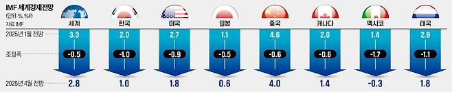 IMF는 미국이 상호관세를 발표한 2일 이전 기준으로는 올해 세계 경제성장률을 3.2%로 1월 전망치(3.3%)보다 0.1%포인트 하향했다. 9일 이후 상호관세 유예와 미·중 보복관세 조치를 반영한 성장률은 2.8%로 종전보다 0.5%포인트 낮춰잡았다. 2026년 세계 성장률도 3.3%에서 2.9%로 하향했다.