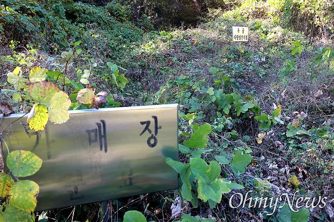 | ▲ 창원 마산합포구 진전면 여양리에 있는 한국전쟁 전후 민간인 학살지. 2002년 유해 발굴 뒤 설치해 놓았던 안내판의 글자가 흐려져 있다. |