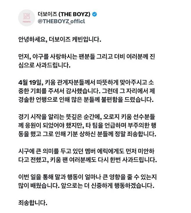22일 케빈은 더보이즈 공식 계정을 통해 "먼저, 야구를 사랑하시는 팬분들 그리고 더비(더보이즈 팬덤) 여러분께 진심으로 사과드린다"라며 고개를 숙였다.
