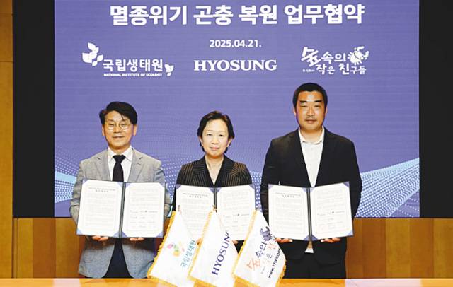 효성그룹은 국립생태원, ㈜숲속의작은친구들과 ‘멸종위기 곤충 복원 및 생물다양성 증진’을 위한 업무협약(MOU·사진)을 맺었다고 22일 밝혔다.
