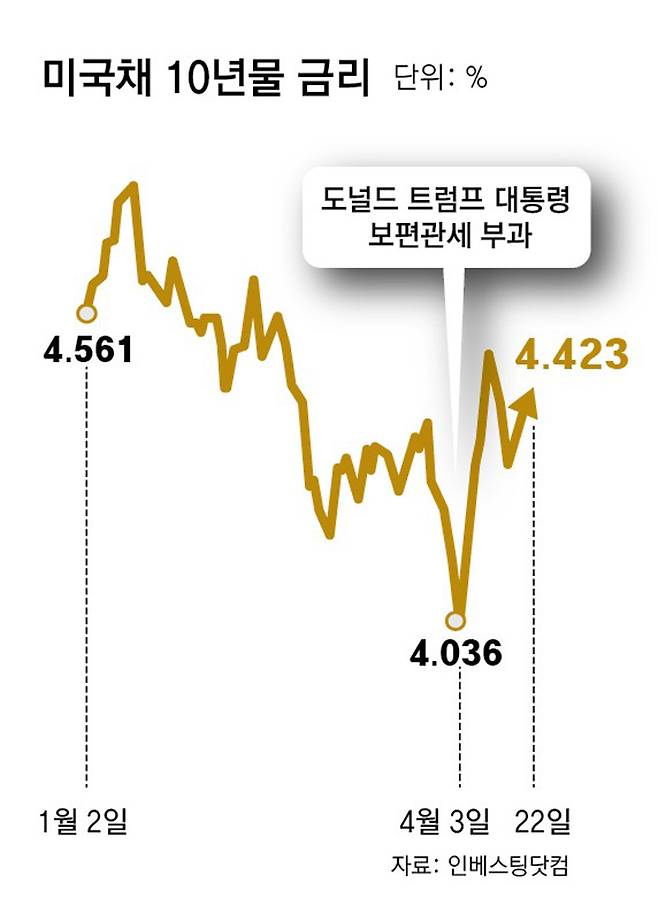 미국의 신뢰도에 금이 가고 기축 통화인 달러화 지위가 흔들리면서 미 채권 가격도 추락했다. 10년물 미 국채 금리는 이달 초까지 3.85%였지만, 최근 4.58%까지 치솟은 뒤 현재 4.4%대에서 움직이고 있다. 주요 6개국 통화 대비 달러 가치를 보여주는 달러인덱스도 97.9까지 떨어지는 등 3년 만에 최저점을 찍기도 했다.