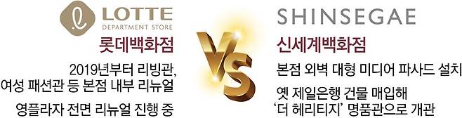 먼저 포문을 연 곳은 신세계백화점이다. 신세계백화점은 지난해 말 본점 외벽 미디어 파사드를 확대 조성한 데 이어 이달 9일엔 옛 제일은행 건물을 럭셔리 전문관인 ‘더 헤리티지’로 보수·개점하는 등 본점을 확장하며 명동 상권 영향력 확대에 나섰다.