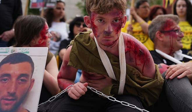 | “우리 형을 돌려주세요” 2023년 10월 팔레스타인 무장단체 하마스에 납치된 이스라엘 군인의 남동생이 부상을 입은 분장을 한 채 21일 이스라엘 수도 예루살렘에서 인질 석방 시위에 참여하고 있다. 이날 하마스는 휴전을 위해 가자지구 통치권을 포기할 가능성을 시사했다. 텔아비브=AP 뉴시스 |