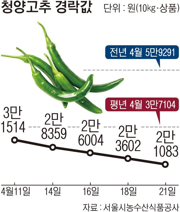 21일 서울 가락시장에서 청양고추는 10㎏들이 상품 한상자당 2만1083원에 거래됐다. 지난해 4월 평균(5만9291원)과 견줘 64.4%, 평년(3만7104원)보다 43.2% 낮다.