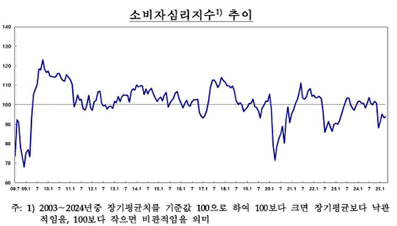 소비자심리지수(CCCI)는 93.8로 전월 대비 0.4p 상승했다. CCCI는 소비자동향지수(CSI) 중 6개 주요 지수를 이용해 산출한 심리지표다..