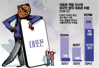 외국인 명의 대포폰 적발 건수는 2023년 2903건에서 지난해 7만건을 넘어서며 1년 만에 약 25배 늘어났다. 외국인 명의 대포폰이 한 해에 7만건 이상 적발된 것은 이번이 처음이다. 경찰이 보이스피싱 범행 수단에 대한 특별단속을 실시한 2021년에 적발된 외국인 명의 대포폰 건수(2만4296건)와 비교해서도 3배에 달하는 숫자다.