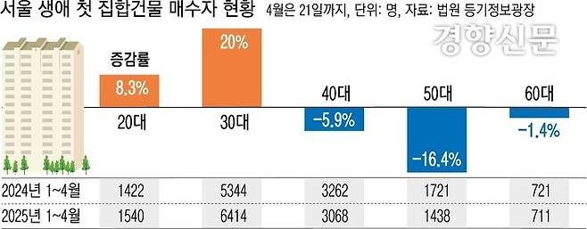법원 등기정보광장의 22일 자료를 보면, 올해 1월부터 4월 21일까지 서울에서 생애 첫 집합건물(빌라·아파트 등)을 산 사람은 1만3464명으로, 지난해 같은 기간(1만2753명)보다 711명(5.6%) 늘어났다.
