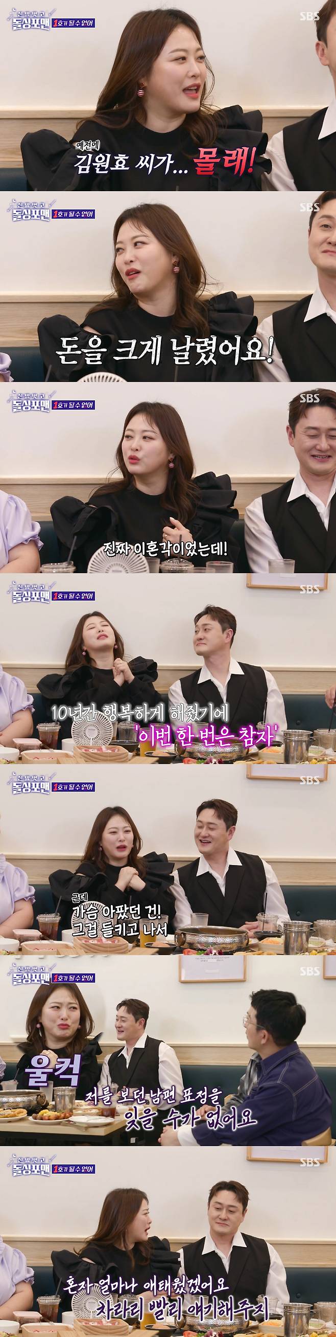 심지어 심진화는 김원효가 돈을 날려 먹은 적이 있다며 "이혼 생각을 한 적이 있다"고 폭탄 발언을 이어갔다.
