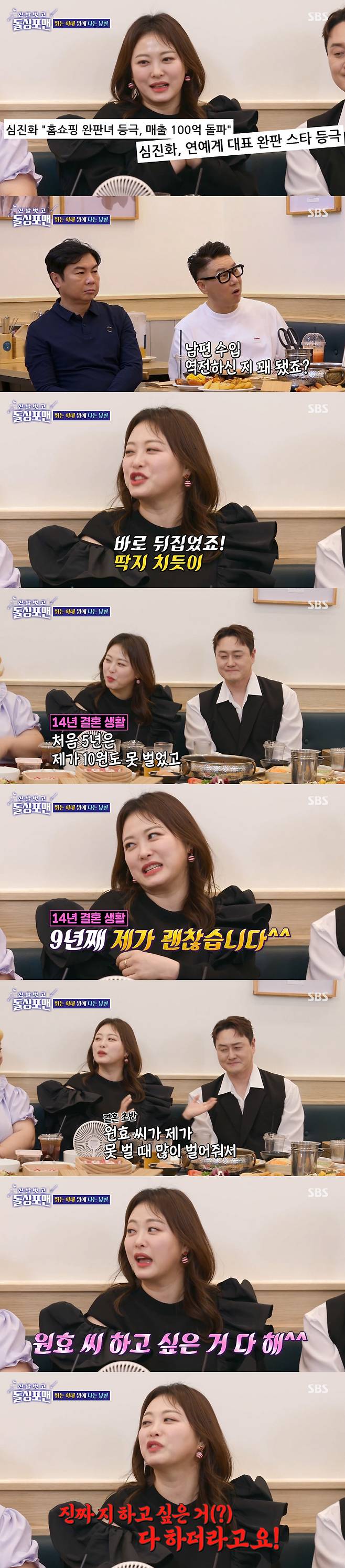 심진화는 "김원효 씨가 결혼 초반에 제가 못 벌때 워낙 많이 벌어줬다. 그래서 제가 수입이 역전 되고 나서는 '원효 씨 하고 싶은 거 다 해' 했다"면서도 "근데 이 한 마디했다가 진짜 지하고 싶은 거 다 하더라"라고 토로했다.