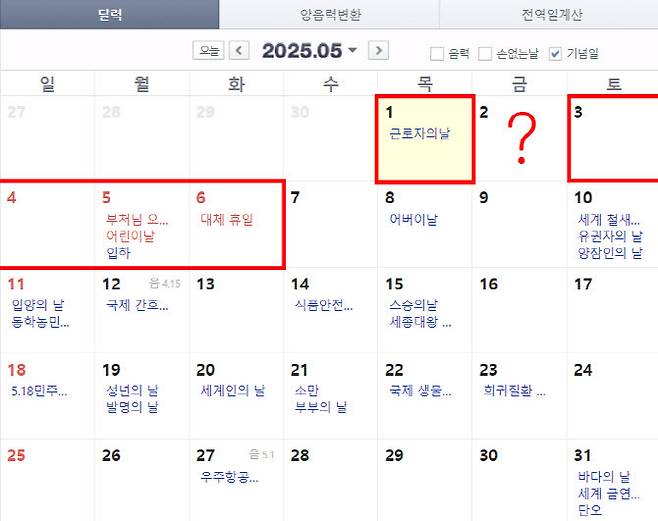 [2025년 5월 달력. (자료=네이버 달력 갈무리)]