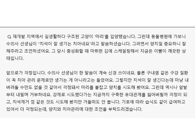 안녕하세요. ‘24시 센트럴 동물메디컬센터’ 원장이자 ‘24시간 고양이 육아대백과’의 저자 김효진 수의사입니다. 오늘은 치석이 생기기 쉬운 고양이라는 말에 걱정이 되신 집사님이 사연을 보내주셨네요. 비단 사연자님의 경우뿐 아니라 고양이는 구강 질환이 많은 동물이라서 집사님들이 고양이 치아 관리에 관심이 많으신데요. 오늘은 어떤 경우에 치석이 잘 생기는지, 또 고양이의 치아 관리는 어떻게 해주면 좋을지에 대해 알아보도록 하겠습니다.